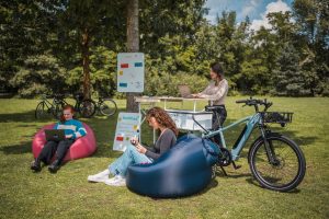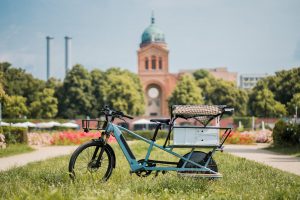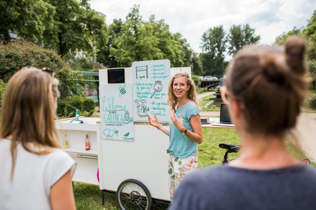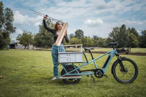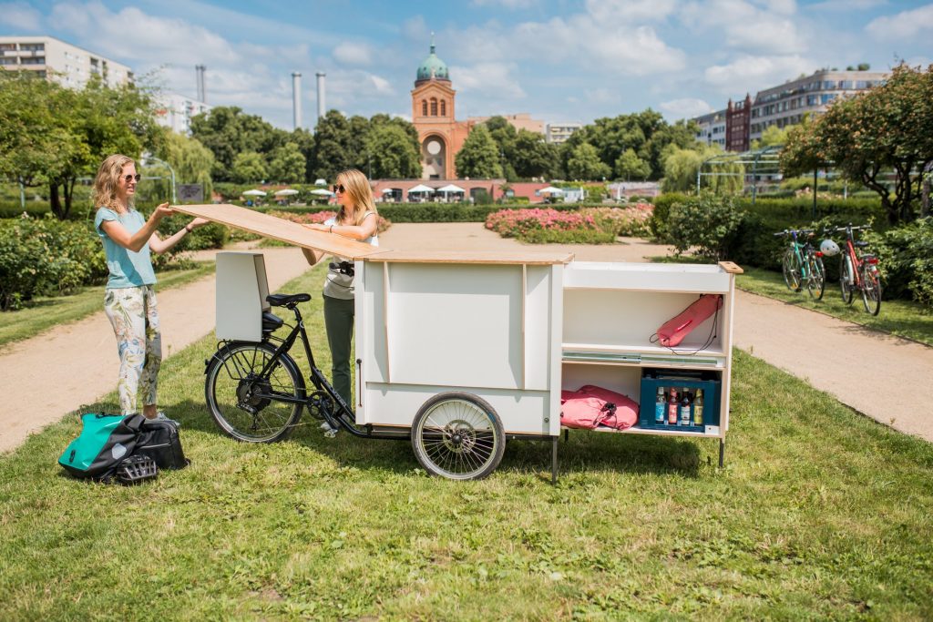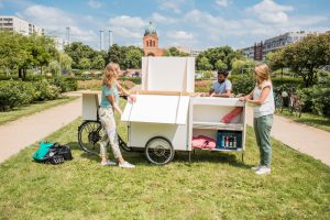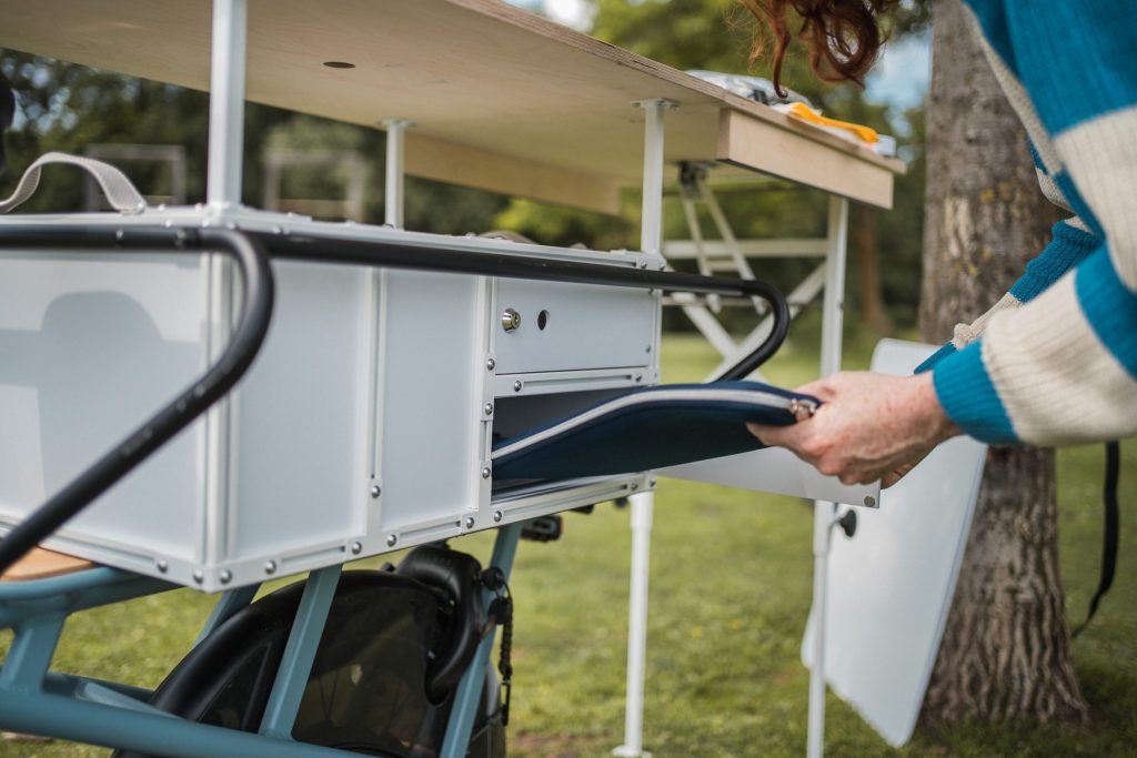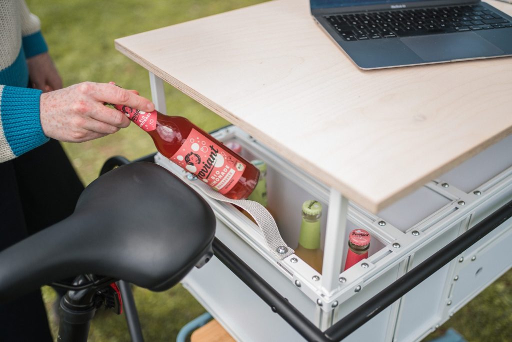 Unsere zwei "flying offices" bringen frischen Wind in den Arbeitsalltag und ermöglichen es, das Büro flexibel an den Ort deiner Wahl zu verlegen. Mit mobilem W-Lan-Router ausgestattet, steht überall zuverlässiges Internet zur Verfügung. Die Whiteboards lassen sich dank eines praktischen Klettband-Systems mit dem M-Modell einfach an Bäumen befestigen, beim XL-Modell direkt am Fahrrad – ideal für kreative Brainstorming-Sessions. Drei Luft-Sitzsäcke bieten bequeme Arbeitsplätze unter freiem Himmel und sorgen für entspanntes Arbeiten. Während das M-Modell schlanker und handlicher ist, bietet das XL-Modell mehr Arbeitsfläche und erweiterten Stauraum für Prototyping- und Moderationsmaterialien.