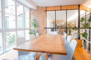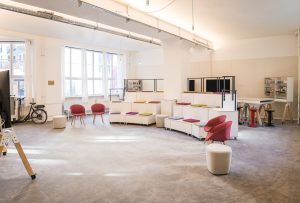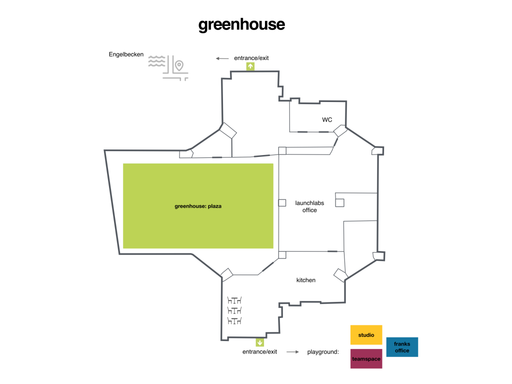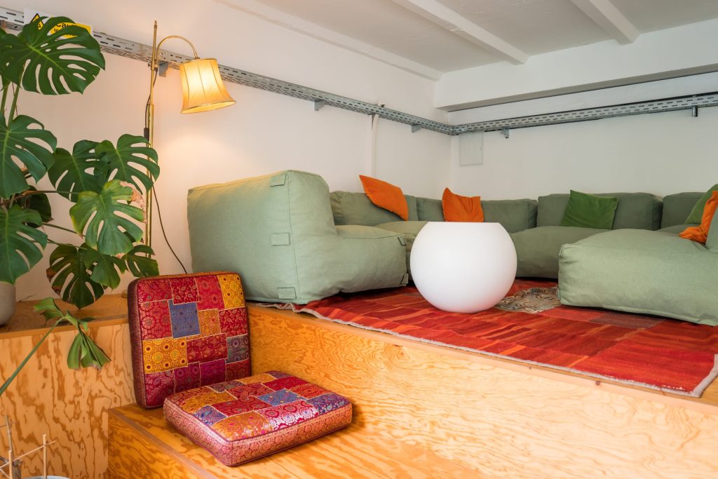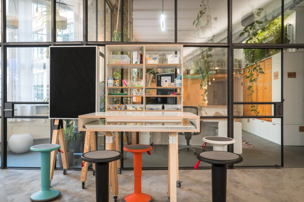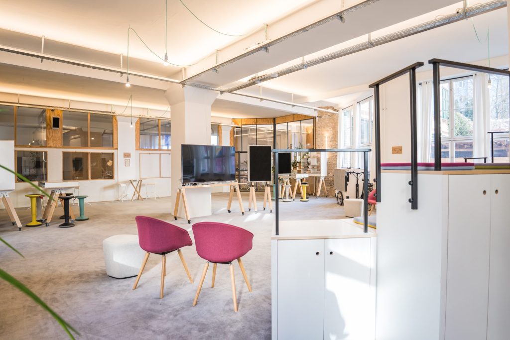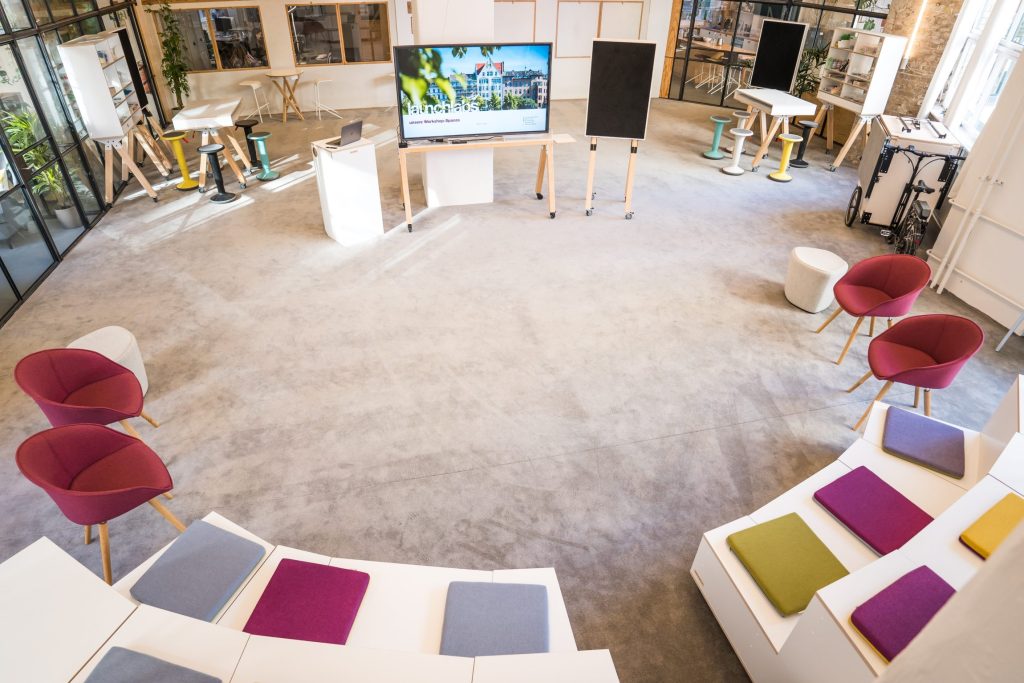 Das Highlight auf der plaza ist unsere frei konfigurierbare Tribüne, die sich sekundenschnell vom Plenarmodus in eine Arena oder in einen Sitzkreis verwandeln kann. Darüber hinaus könnt ihr mit unseren speziell für Teamarbeit entwickelten, mobilen Regalen, Präsentationswänden und Stehtischen, sowie passenden Stehhilfen dynamische Breakout-Flächen für kleinere Teams gestalten. Jede Kleingruppe hat direkten Zugriff auf nachhaltiges Moderations- und Bastel-Material, welches in den gut sortierten Regalen bereit liegt. Präsentationen, Videos und andere digitale Inhalte lassen sich an jedem beliebigen Ort auf der Plaza einfach auf dem rollbaren 75” Monitor darstellen, entweder kabellos via Airplay oder klassisch über HDMI-Anschluss. Neben der Fläche gibt es mehrere Rückzugsorte und einen abgetrennten, kleinen Meetingraum, der frei zugänglich ist. Unsere bestens ausgestattete Loft-Küche mit Sitztheke und Esstisch bietet das perfekte Setting für ein gemütliches Beisammensein in Pausen.
