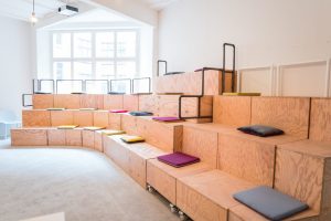 Kernstück des studios ist die große Moderations- und Präsentationswand, auf der sich über einen lichtstarken Beamer digitale Inhalte perfekt in Szene setzen lassen. Zusätzlich stehen mehrere Flächen zur Präsentation mit Whiteboards zur Verfügung. Für einen freien Blick auf die Inhalte sorgt im studio sowohl eine feste Tribüne, als auch fünf flexible Tribünenteile, die sich sekundenschnell vom Plenarmodus in eine Arena oder in einen Sitzkreis verwandeln können. Daneben bieten stapelbare Stühle noch mehr Sitz- und Interaktions-Möglichkeiten. Nutzer*innen des studio können für Pausen auch das direkt angrenzende, inspirierende Community-Café mitbenutzen. Hier finden sich Kaffeemaschine, Kühlschrank und Getränketheke; am rustikalen Esstisch und in der Lounge finden sich weitere Sitzmöglichkeiten.