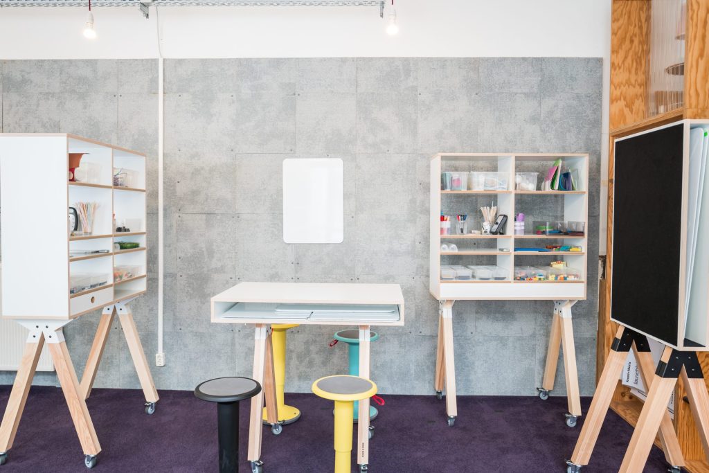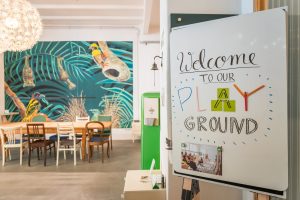 Der 40 qm große teamspace ist ein agiles Arbeitsumfeld für maximal 24 Personen, die sich auf bis zu 6 mobile Teaminseln verteilen können. Bei jeder Teaminsel finden sich nachhaltigen Moderations- und Bastel-Materialien. Über die Kreativ-Materialien hinaus ist der teamspace für digitale Inhalte standardmäßig mit einem LED-Projektor ausgestattet. Ein Highlight ist die knapp 20qm große Teamwall, die komplett als Whiteboardfläche genutzt werden kann. Außerdem gibt es mit der Box einen gemütlichen Meetingraum mit Flatscreen, der direkt unter unserer kleinen Indoor Terrasse zum Entspannen liegt.