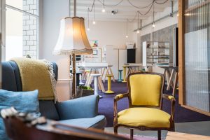 Nutzer*innen des teamspace können für Pausen auch das direkt angrenzende, inspirierende Community-Café mitbenutzen. Hier finden sich Kaffeemaschine, Kühlschrank und Getränketheke; am rustikalen Esstisch und in der Lounge bieten sich weitere Sitzmöglichkeiten. Der teamspace ist ein offener Raum, dies schafft mehr Weite und Bewegungsfreiheit, doch Türen können hier nicht hinter sich geschlossen werden.